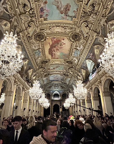 しばしばショー会場として使用されるパリ市庁舎内のイベントホール。天井画が歴史を感じさせる。