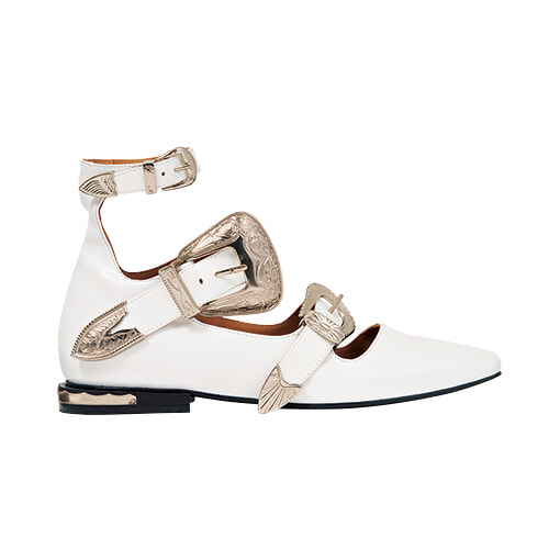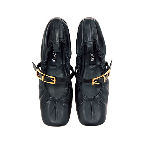 メタリックなバックルが目印の「エスアール ノラ」のラインナップにバレエシューズ型が加わった。