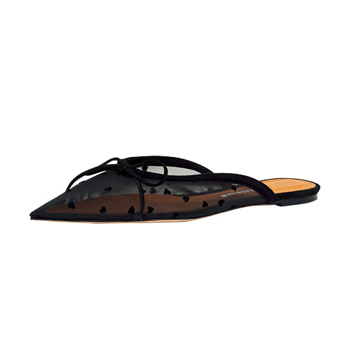 ハート柄のチュール素材と鋭角的なトウが大人スイートな気分。