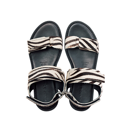 スポーツサンダルをゼブラ柄のヘアカーフ素材でモードにシフト。
