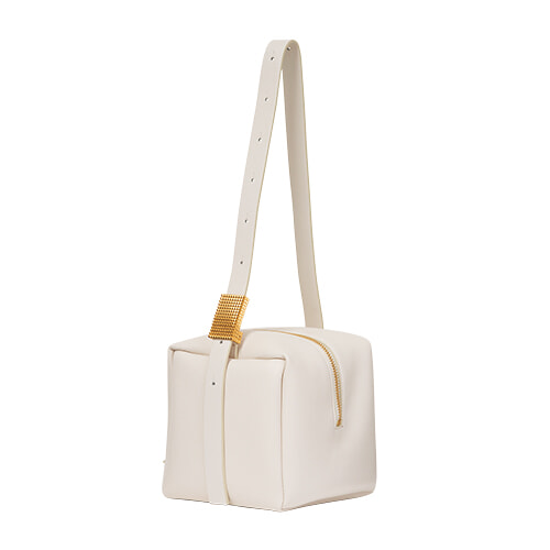 サイコロのような立方体が新鮮なバッグは、さりげなくブランドの頭文字を配したゴールドバックルも見逃せない。