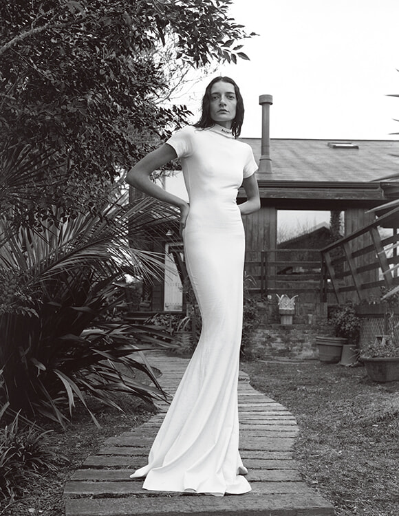 トップはハイネックのTシャツ、ボトムスはマーメイドシルエットのフルレングススカート。そのコントラストが鮮やかなマキシドレスは、ストレッチジャージーで仕立てられたもの。首元にはさりげなく、ブランドのロゴが描かれて。