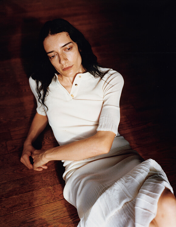 透け感のあるコットンリブのヘンリーネックTシャツは、袖口のプリーツ加工がアクセント。スカートの裾にもアシメトリーなプリーツが施されていて、足さばきのよさとデザイン性をもたらしている。