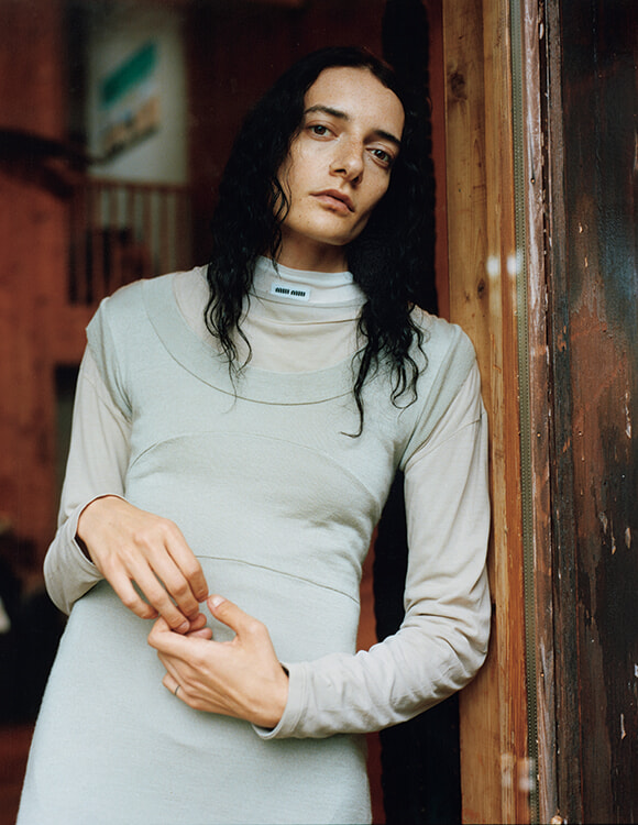 タンクトップドレス¥308,000、ロングスリーブTシャツ¥137,500、中に着たTシャツ¥137,500、タグ付きTシャツ¥119,900(すべて予定価格)/以上ミュウミュウ(ミュウミュウ クライアントサービス)