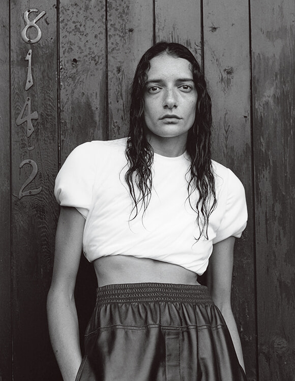 バイヤス状にドレープを寄せた身頃、パッドを入れて膨らませた丸いフォルム。時には存在感たっぷりのトップでモードな気分を満喫する。ハイウエストのレザーパンツとのバランスもいい。