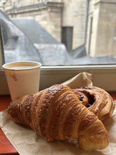 ホテルの朝食を食べない日はこれが定番。クロワッサンとパン・オ・レザン。