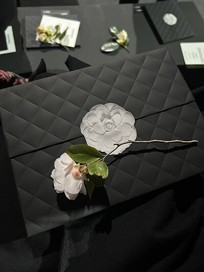 コレクションのイメージビジュアルとともに本物のカメリアの花が全員のシートに。