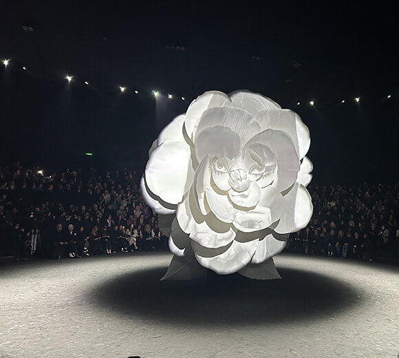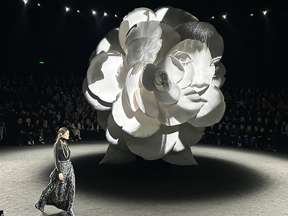 そう、今回のテーマはカメリア。ランウェイとなるホールに移動すると、そこにも巨大なカメリアのオブジェ、シートには本物のカメリアの花、そしてフロントローには小松菜奈さんとイネスの姿が。夫の菅田将暉さんも隣に座ってます。会場が暗転すると、ランウェイ中央のカメリアにまたもや小松菜奈さんの姿が映し出され、いよいよショーの開幕です。