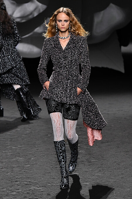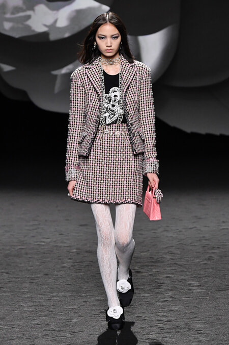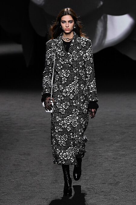 ファーストルックは、カメリアを織り込んだツイードのモノトーンのロングコート。続く黒のレザーのトレンチコートはカメリアのエンブロイダリーで襟を埋めつくし、黒のツイードスーツには大小の白のカメリアを全面にちらして、とあらゆるルックにカメリアが咲き誇ります。プリントもあればニットの編み柄もある、ツイードのスーツの裏地やボタンも。白と黒の2色で登場するレースタイツもカメリア柄とさまざまに展開されます。共通点があるとしたら、どのルックのカメリアも優しく力強く、フレッシュということ。ヴィルジニー・ヴィアールはメゾンの永遠のコードを再解釈、現代的リアリティを加えてそのアリュールを刷新している。ジャケットに合わせた軽快なバミューダショーツ、アシンメトリーなシルエットのツイードジャケット、ニットに重ねたプリントのコンビネゾンやロングドレスなど、彼女らしいボヘミアンテイストがこのコードをモダンに変換。シンプルすぎるくらいシンプルなテーマをヴィアールは幅広く奥深く表現していったのです。30年以上に渡り亡きカール・ラガーフェルドとともにメゾンを支え、シャネルの遺産をしっかりと継承してきた彼女だからこそできること。彼女の手腕でより自由にロマンティックになったカメリアは、時代を超えて進化していくシャネルのヴィジョン。誰の心にも咲く、永遠のファッションの花なのです。