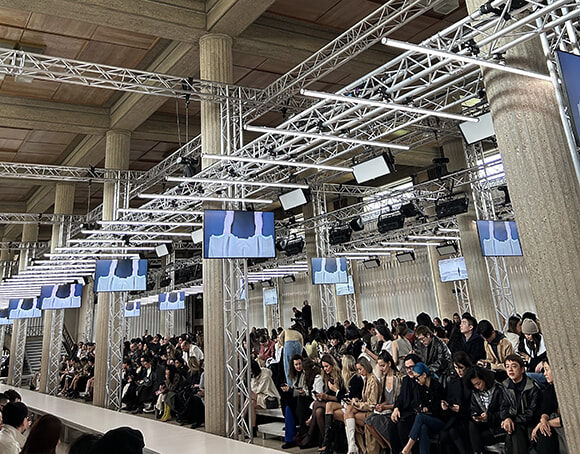 さっきまで真っ白だったランウェイのカメリアに小松菜奈さんの映像が現れて、ショー開始。