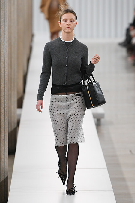 いよいよショーが始まると、ファーストルックから見るという行為に没入します、いやせざるをえない、もう目が離せない。オープニングに登場したのは俳優のミア・ゴス。グレーのコンパクトなツインニットにモノトーンの水玉のタイトスカートというどちらもベーシックな色、ベーシックなデザインのアイテム。ニットのインに白のTシャツを合わせているのも普通だし、足元はキトゥンヒールのスリングバックシューズ、ボストンバッグを肘にかけてとクラシカルといっていいコーディネート。でも、スカートからは黒のパンティストッキングのウエストあたりがまる見え、そしてニットはそのパンストにイン。本来なら隠すものをわざと見せる、それもパンストは、お腹よりショーツよりさらにインパクトがある。後ろでまとめた品のいいヘアも髪の毛が部分的に逆立って、メッシーに乱れている。ちょっとありえないスタイルなのにありえないほど可愛い! 期待どおりの先シーズンの先をいく高揚感です。