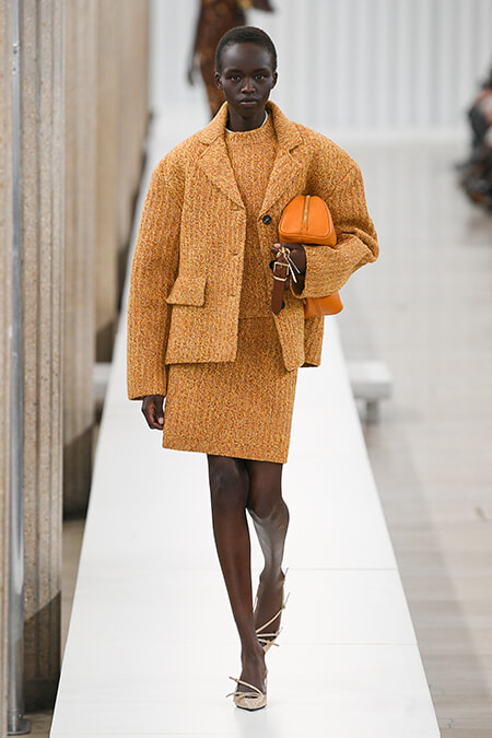 クラシックなアンサンブルをローゲージのメランジニットでアップデート。張りのあるフォルムが新鮮。 photo:Imaxtree