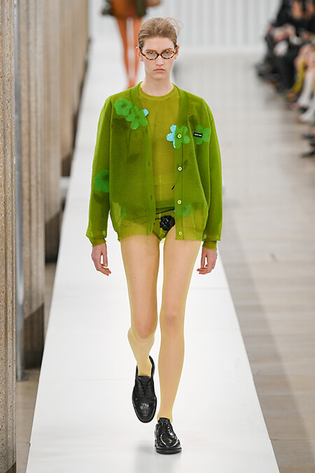 「より綿密な観察を必要とし探究心や好奇心を呼び起こす」とミウッチャがいうルックはその後も続きます。アイテムもカラートーンも徹底してオーセンティック、でも素材を変え、ボリュームを変え、そしてインとアウトのルールを変えて提案されるミュウミュウ流のチャーミングなレイヤードばかりです。 基本はクラシックながら、重ね方、はずし方が新しい。コーデュロイやボンディングのフーディはさらにピーコートを重ねて、でもボトムはショーツ見せのニットブルマーという斬新なスタイリング。Tシャツ×ニット×フーディ×コートというさらなる重ね技もあれば、微妙な色のトーンのレザージャケットをダブルで着るレイヤリングもあり。ボトムは透けるスカート、レギンス、そしてなによりもショーツ見せブルマーがパンストと並ぶ今シーズンの主役といえそう。ときおり登場するべっこう風メガネもギークなムードを醸し出している。立体的な花のアップリケを施した透けるツインニットとショーツにウィングチップシューズ、メガネをかけたルックはこれぞミュウミュウ・ガール!です。