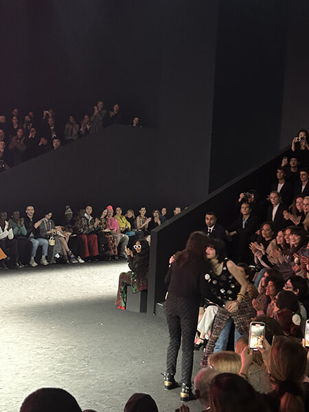 モデルたちのウォーキングの間ずっと小松菜奈さんが映し出されていたカメリアのオブジェ。その白い花がピンクから赤、オレンジと艶やかに染められてショーはフィナーレを迎えます。「赤、それは命の色、血の色」というガブリエル・シャネルの言葉を思い出しますね。ハイライトはランウェイを歩いてきたヴィアールがフロントローに座るイネスと小松菜奈さんの元に歩み寄り、ハグをしたこと。長年ショーを取材してきましたが、こんな光景は滅多にない! それだけあのフィルムが彼女にとってもエモーショナルなものだったのでしょう。なんだかこちらまで誇らしい気分に。ショー後もたくさんの称賛の声をかけられていた菜奈さん、彼女だけでなくその隣の菅田さんも本当に幸せそうでした。