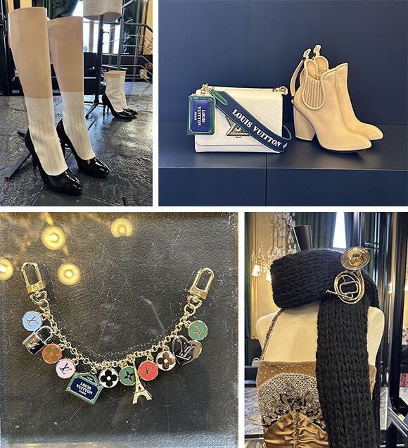 上左:黒のパンプスに白ソックスというフレンチな足元をなんとブーツに。生足の肌色もバリエあり。 上右:通り名プレートはカードケースやネームタグなどのスモールレザーグッズにもアレンジ。 左:さらにエッフェル塔のチャームも加わってキーチェーンに。パリのスーベニア風ですが、でも可愛い。 右:マフラーをブローチで留めてという懐かしいコーディネート。秋冬小物ではクラシックなブローチに注目しています。