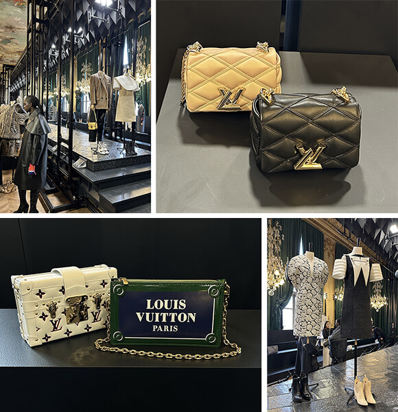 最終日ラストのミュウミュウの前に、オルセー美術館を再訪、ルイ•ヴィトンのRe-seeを今度は携帯電話とともに取材。昨日撮影できなかった分を取り戻さなくちゃ。昨日のランウェイのセットを残したままの「Le Restaurant d’Orsay」に発表されたばかりのルックや小物が展示されています。間近で見ると、石畳やマンホールが精巧に再現されていることがよくわかる。ランウェイではシルエットに目を奪われていたルックはどれもアーティスティック・ディレクター ニコラ・ジェスキエールらしい最新のファブリックが使われ、ディテールにはアトリエの細かい手仕事が施されている。ウールのように見えたコートが実はレザーだったり、ストライプはプリントではなくステッチだったり、という驚きの連続です。アンバサダーのチョン・ホヨンがフィナーレに着たドレスの花はすべて刺繍とのこと。ジェスキエールのフレンチスタイルを完成させるのは、そうしたメゾンの職人技ということを実感します。小物はどれもユーモラスでシックで、パリ好きにはたまらないものばかり。黒のパンプスに白のロゴ入りソックスを合わせたトロンプルイユのブーツはショートとロングの2タイプ、石畳を思わせる菱形模様のキルティングバッグ、そしてそして、なんといってもパリの通り名を表示するプレートを模したバッグやスモールレザーグッズ。緑のトリミングに紺、文字は白という組み合わせもそのまま。これ、絶対に欲しい! です。完全に個人目線でのレポートですが、ルイ・ヴィトンらしいプレイフルなフレンチ・スタイル、伝わってますよね。ランウェイで目立っていたホルンやクラリネットの管楽器モチーフのブローチもディテールまで細密に表現されてました。ペンダントやリングもあります。