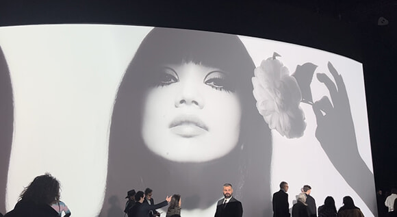 ランウェイの両サイドのスクリーンに韓国人アーティスト、ジョン・グムヒョンの映像作品が写し出されて。