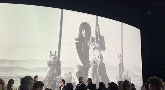 一歩足を踏み入れると、目の前は一面、巨大なスクリーン。そこにメリーゴーランドの木馬に乗って海から小松菜奈さんが現れます。アパルトマンのソファで足を投げ出す菜奈さんもいれば、顔のアップ、目や鼻のクローズアップというシュールなシーンも差し込まれて。ショー前のティザー動画ですが、前回のクリステン・スチュワートに代わって、この秋冬は小松菜奈さんが主役。すべてセットを組んで撮影したというモノクロの映像は、ティザーというより一編のショートムービーのよう。イネス&ヴィノードによるこのフィルムはウィリアム・クラインの映画『ポリー・マグー お前は誰だ』をインスピレーション源に製作されたとか。菜奈さんが演じるのは彼らいわく「パリに住む、軽快で自由な精神を持った日本人女性」。それはアーティスティック ディレクター、ヴィルジニー・ヴィアールが考える今シーズンの女性像でもあるのでしょう。なにより、自由な精神はガブリエル・シャネルから引き継がれるメゾンの規範ともいうべきもの。それを体現している菜奈さんはまさに今シーズンのミューズですね。
