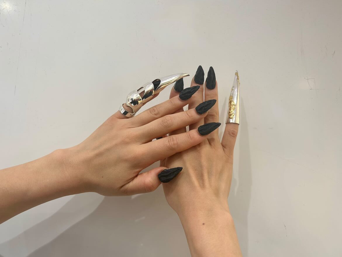 ダークなスティレットネイルにコンテンポラリーなジュエリーを。