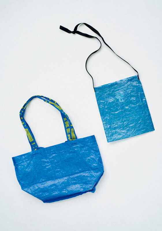 飼い猫がベッドでおしっこをしてしまった時、慌ててイケアの寝具コーナーに行って出合った、ブルーシートのバッグ。色褪せた風合いが好きなので裏返して使っている。右のゼプテピとショップ兼ギャラリー、ソルトアンドペッパーのコラボポーチも友人の勧めで購入。安価なものでも高価なものでも、大事に思う気持ちは変わらないという。(朝吹)