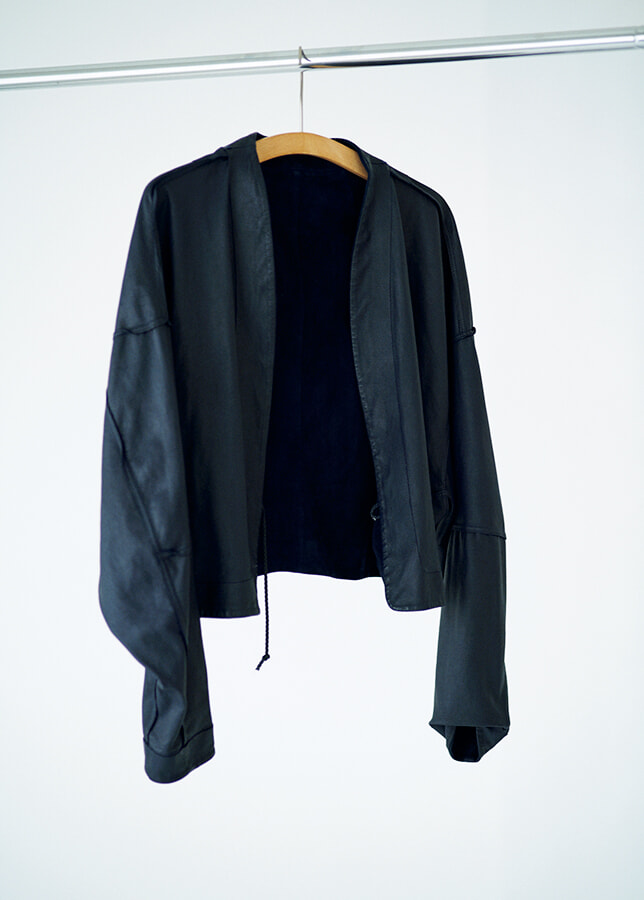 もっぱら裏返しで着ているというトッズとマメ クロゴウチのコラボカーディガン。レザー製。(朝吹)