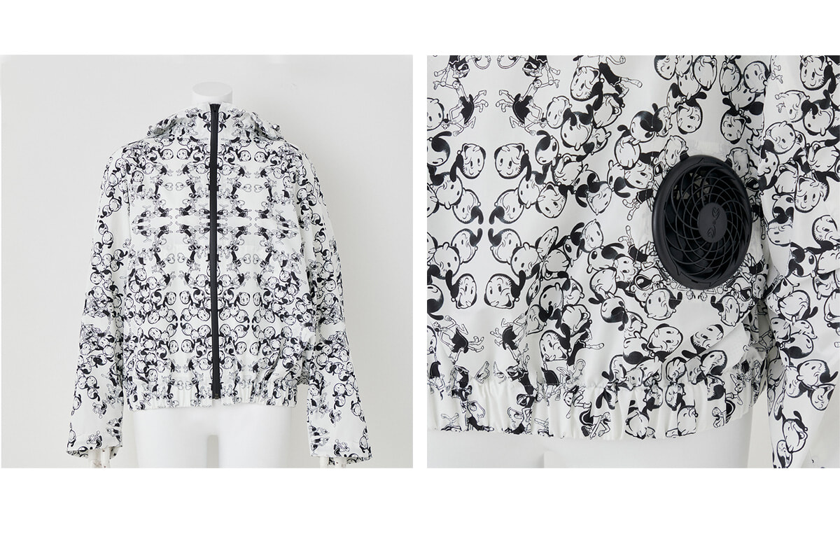 J_O×SANYOCOAT×空調服の3社によるコラボアウター。裾ゴムは風を逃さず空気の流れを作り、2個のファンから取り込んだ外気は、汗を蒸発させながら、襟元と袖口から排気される。汗をかきやすい部分に風が流れるよう、裾部分は空気を漏らさないような仕組みになっていて快適な着心地。フード付きコート(本体)¥108,900、(ファン)¥15,950(ともに6/23発売)/ともにヤンチェ_オンテンバール *本体とファンは別売り。
