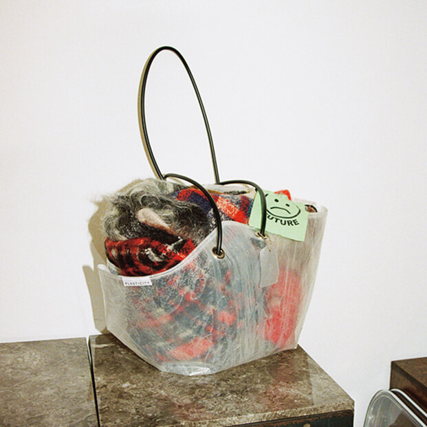 プラスティシティのバッグは、捨てられたビニール傘を再利用して作られたもの。(eri)