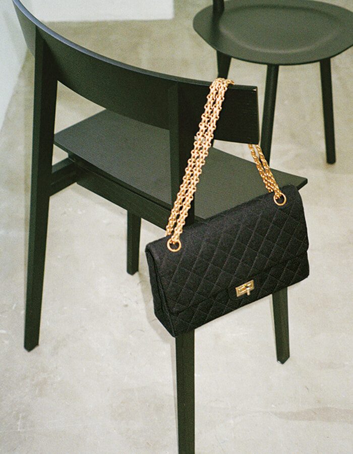 シャネルのバッグは、パリで購入したヴィンテージ。「自分の中でレザーに対する答えが出ていない」ことから、ジャージー素材のモデルを選んだ。二階堂