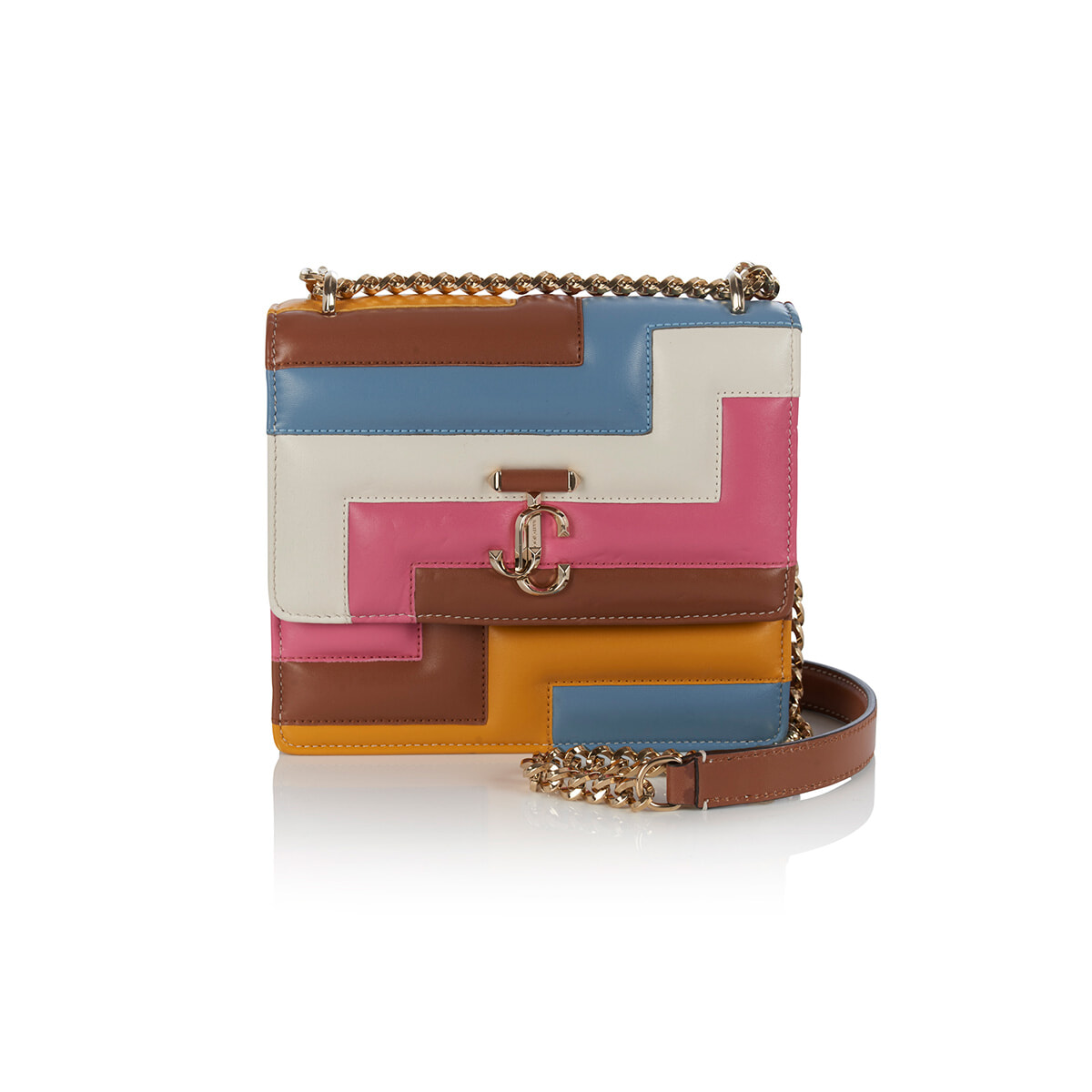 JCモチーフでおなじみの人気アイコンバッグに、マルチカラーが登場。グラフィカルなパターンとキルティングの凹凸感がベストマッチ。