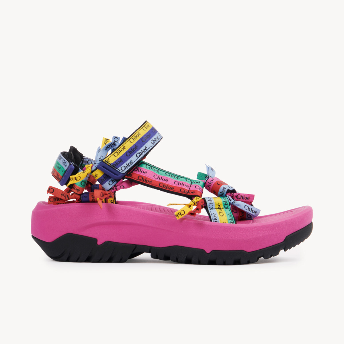 テバの代表的なスポーティサンダルを、クロエのロゴを満載したカラフルなリサイクルポリエステルのストラップで再解釈したコラボサンダル。