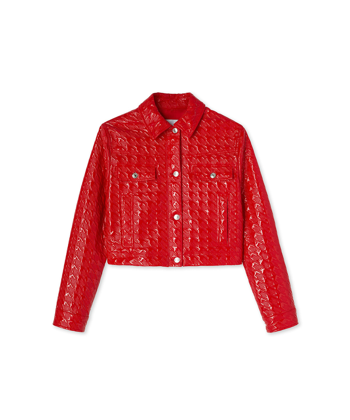 キャンパスルックをモダンに再考したプレフォールコレクション。鮮烈なレッドが、エコレザーの光沢感や千鳥格子のエンボス加工でさらにインパクトアップ。
