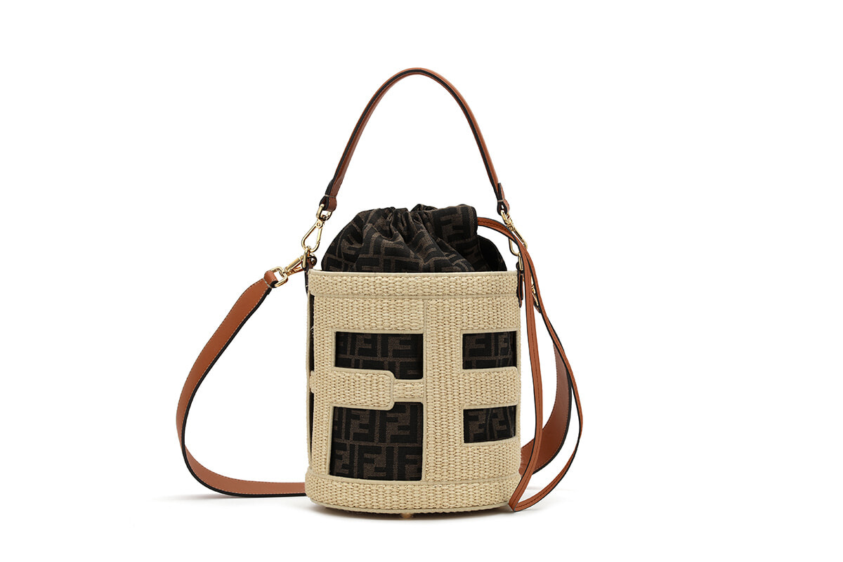 ブランド名のレタリングが周囲を囲むバケット型のストローバッグの中にはFFロゴのジャカードファブリックの巾着袋が。ダブルでフェンディのエッセンスを楽しめる。