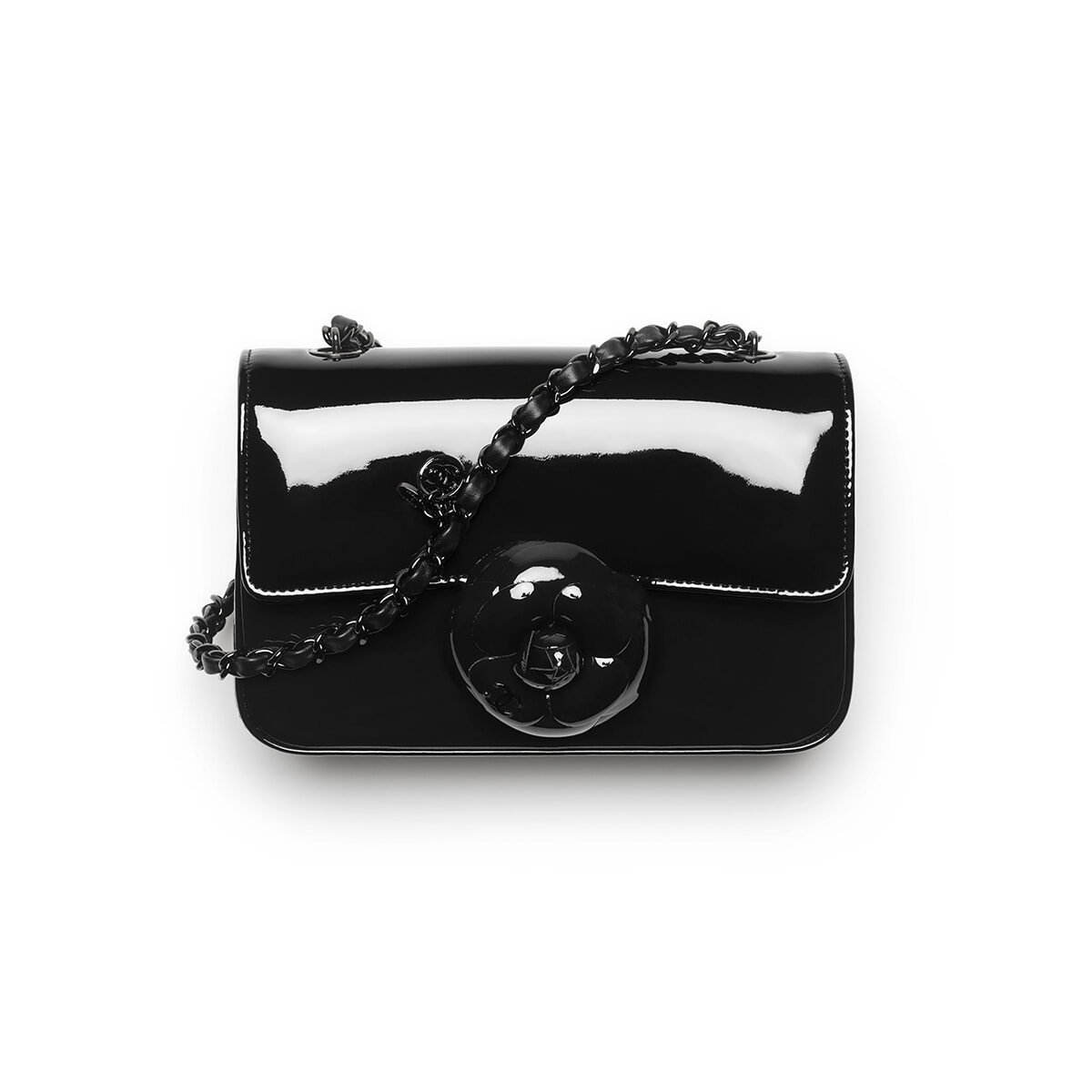 ガブリエル・シャネルが愛したカメリアの花が愛らしいチェーンバッグ。エナメルのツヤ感とブラックのワントーンが可憐でありながらもシックな美しさを醸し出す。