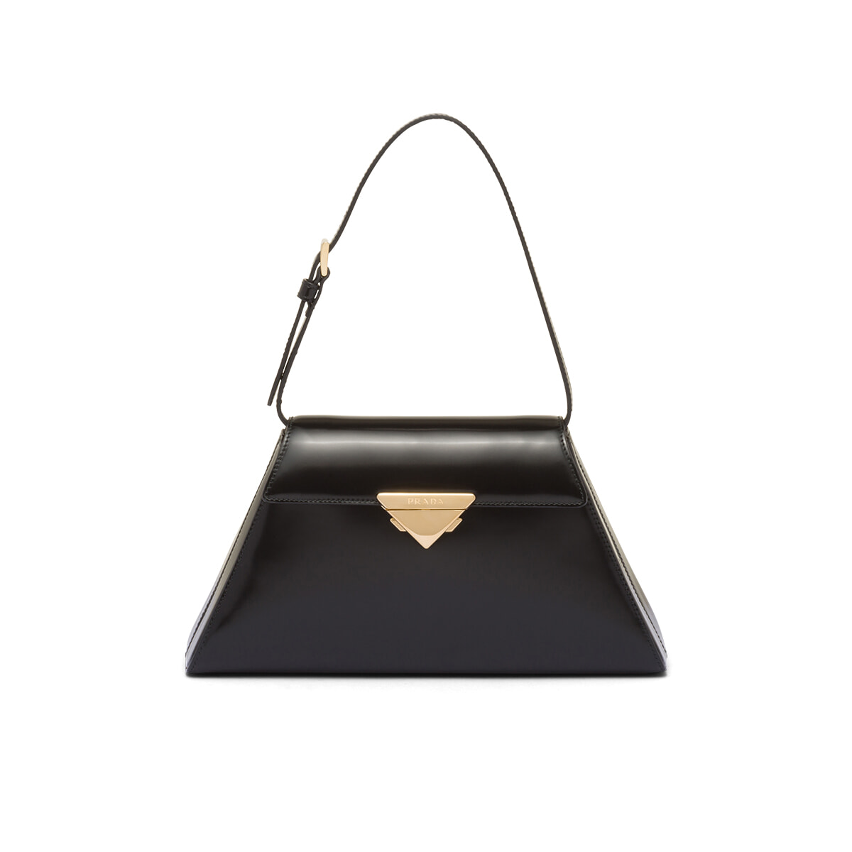プラダのシグネチャーモチーフであるトライアングルを取り入れた新作バッグ。フォーマルシーンでもデイリー使いでも気品溢れる趣で、永く愛せること請け合い。