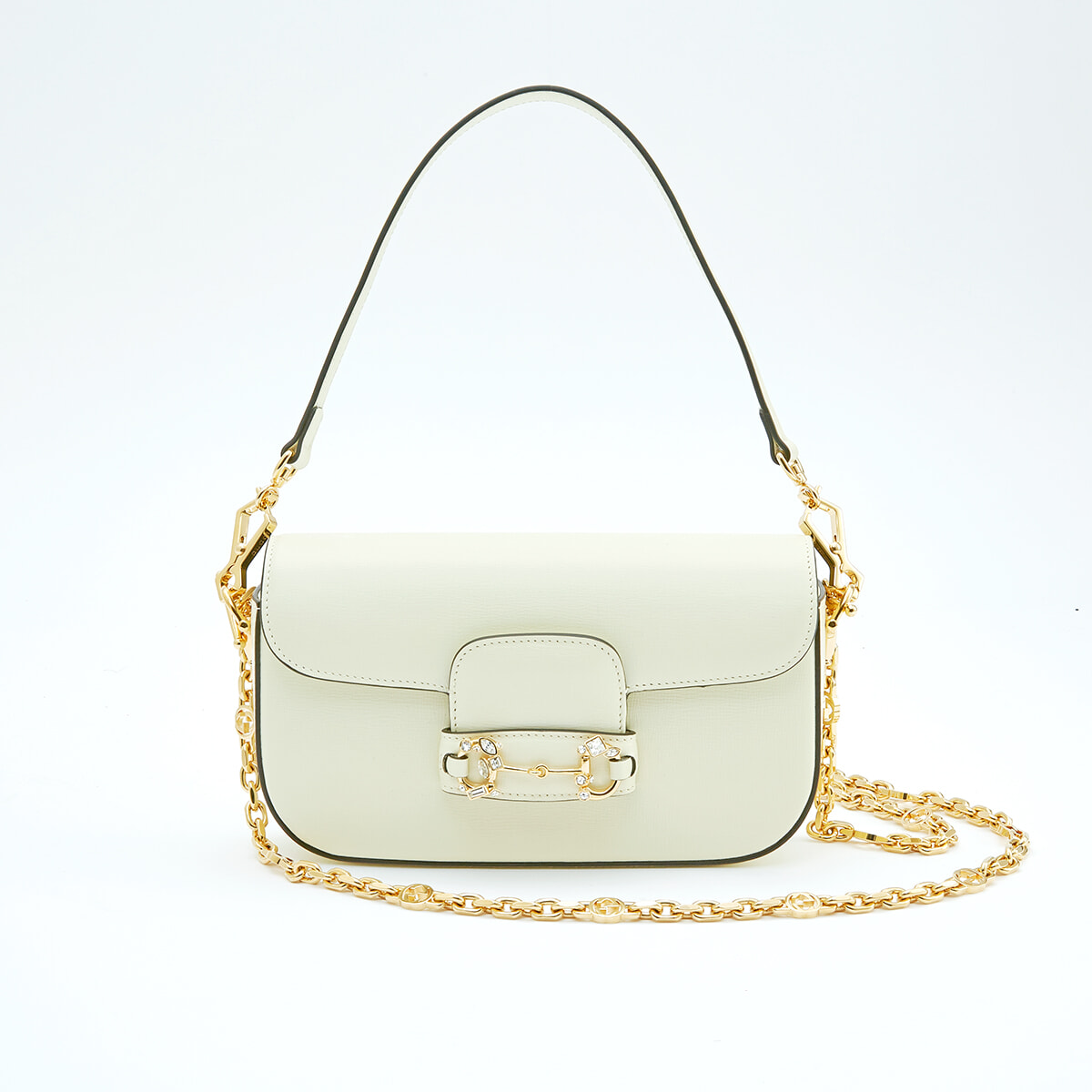 馬具のハミからインスピレーションを得て、ダブルリングとバーで構成されたホースビットに、クリスタルが施されたリュクスなデザイン。チェーンストラップ付きでクロスボディとしても活躍。