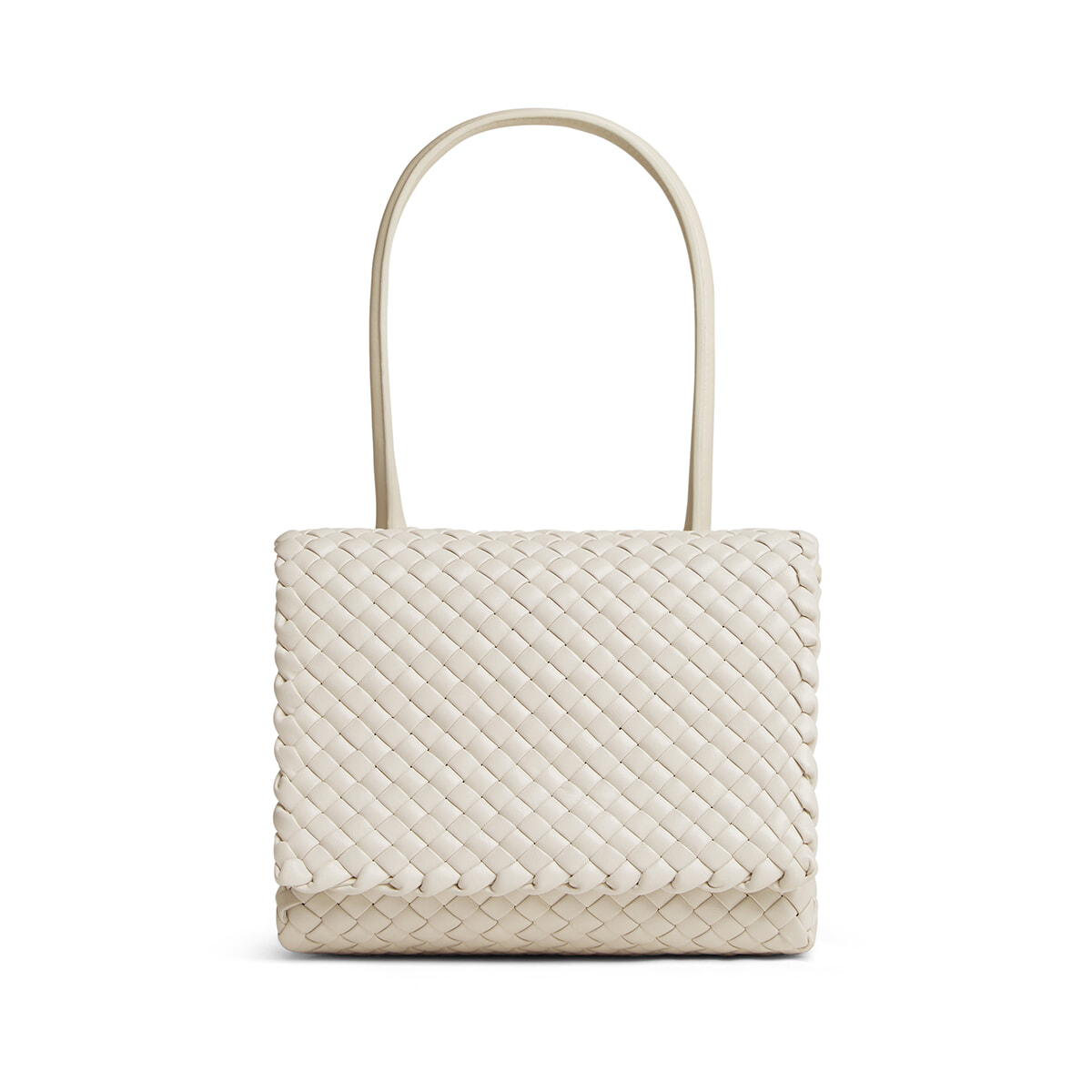 ブランドのアイコンディテール、イントレチャートレザーのトップハンドルバッグ。マットな質感のチョークカラーと、しっとり柔らかなラムスキンの組合せがモダンで上品。ファスナー付きポケットとオープンポケットを内蔵し、使い勝手のよさも魅力。