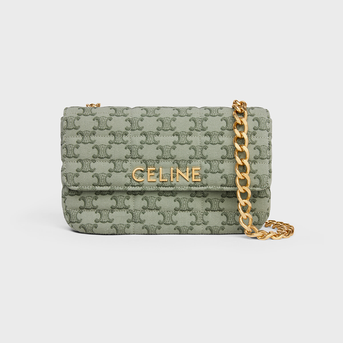 トリオンフが全面に施された爽やかなグリーンのボディと、太めのゴールドチェーンが絶妙なバランス。上品でフェミニンな雰囲気を身に纏って。肩掛けできるチェーン付き。