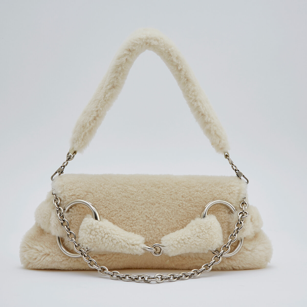 グッチのアイコンであるホースビットがフロントに大胆に配された「グッチ ホースビットチェーン」は、アーカイブよりインスピレーションを得てデザインされた。モコモコとした素材とシルバーの組合せがモダンな印象で、クラッチとしても活躍。