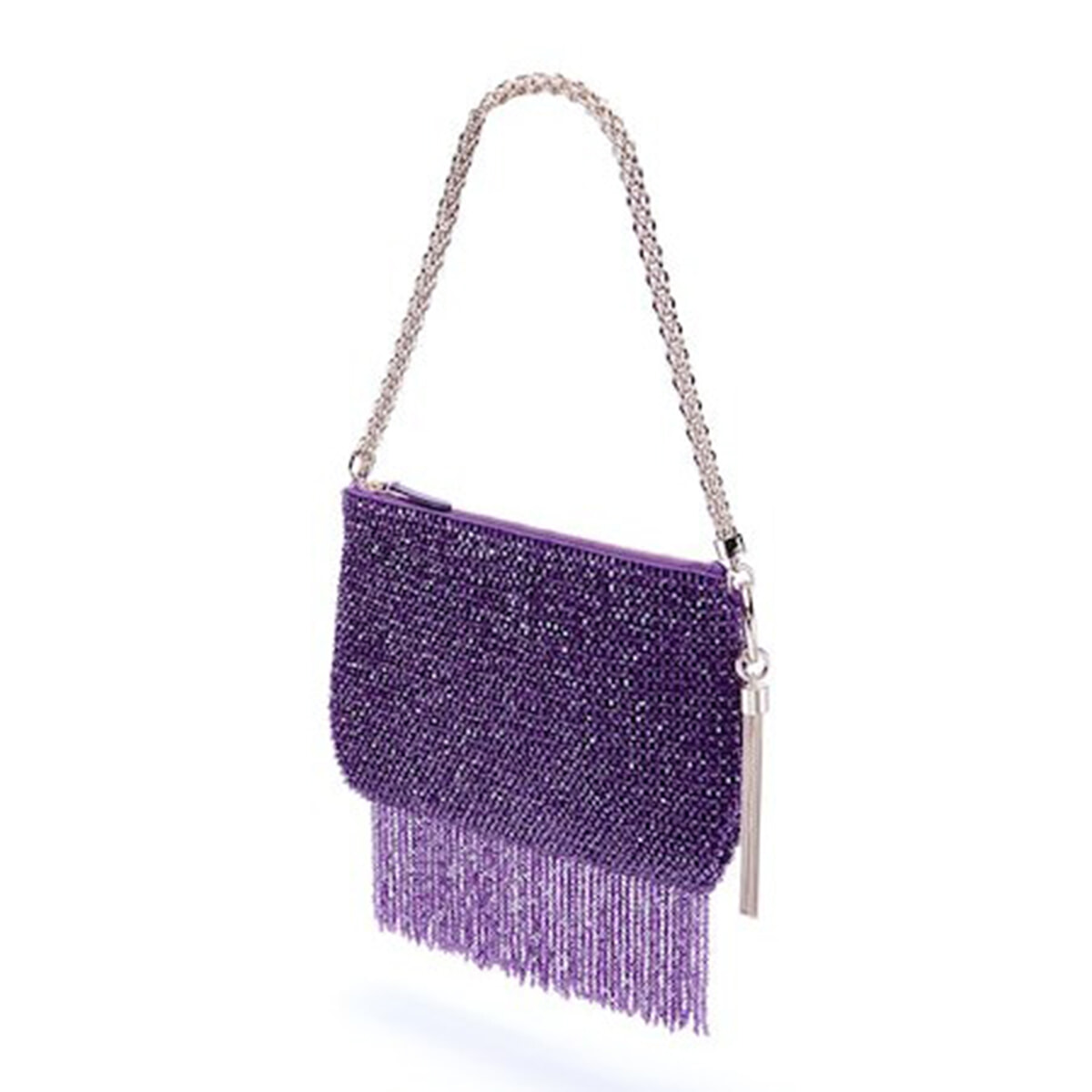アシッドパープルのクリスタルフリンジがゴージャスなハンドバッグ。揺れるフリンジと上品なライトゴールドのチェーンが、センシュアルで洗練されたアティチュードを演出。