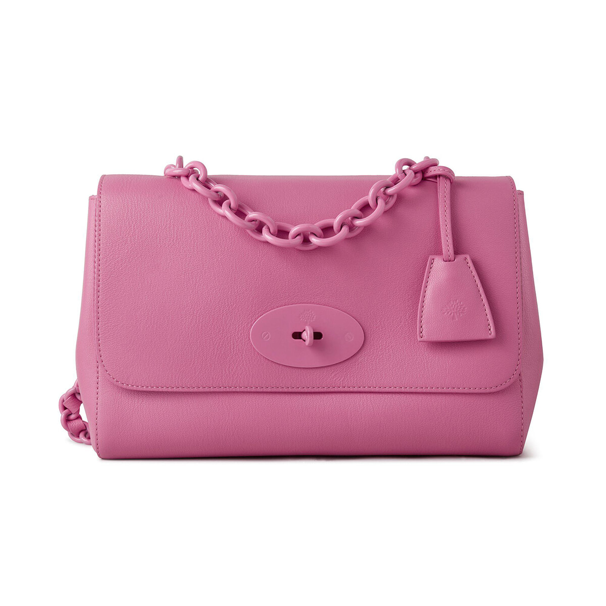 エフォートレスな上品さを感じさせる「リリー バッグ」から、ひと回り大きい「ミディアム トップ ハンドル リリー」が登場。細かいシボと柔らかな手触りを誇るピンクのカーフレザーに、同色のダブルチェーンストラップをあしらい、ポップで愛らしい表情に。マルベリーの特徴である、ターンロック式の止め金具、ポストマンズロックのディテールもポイント。