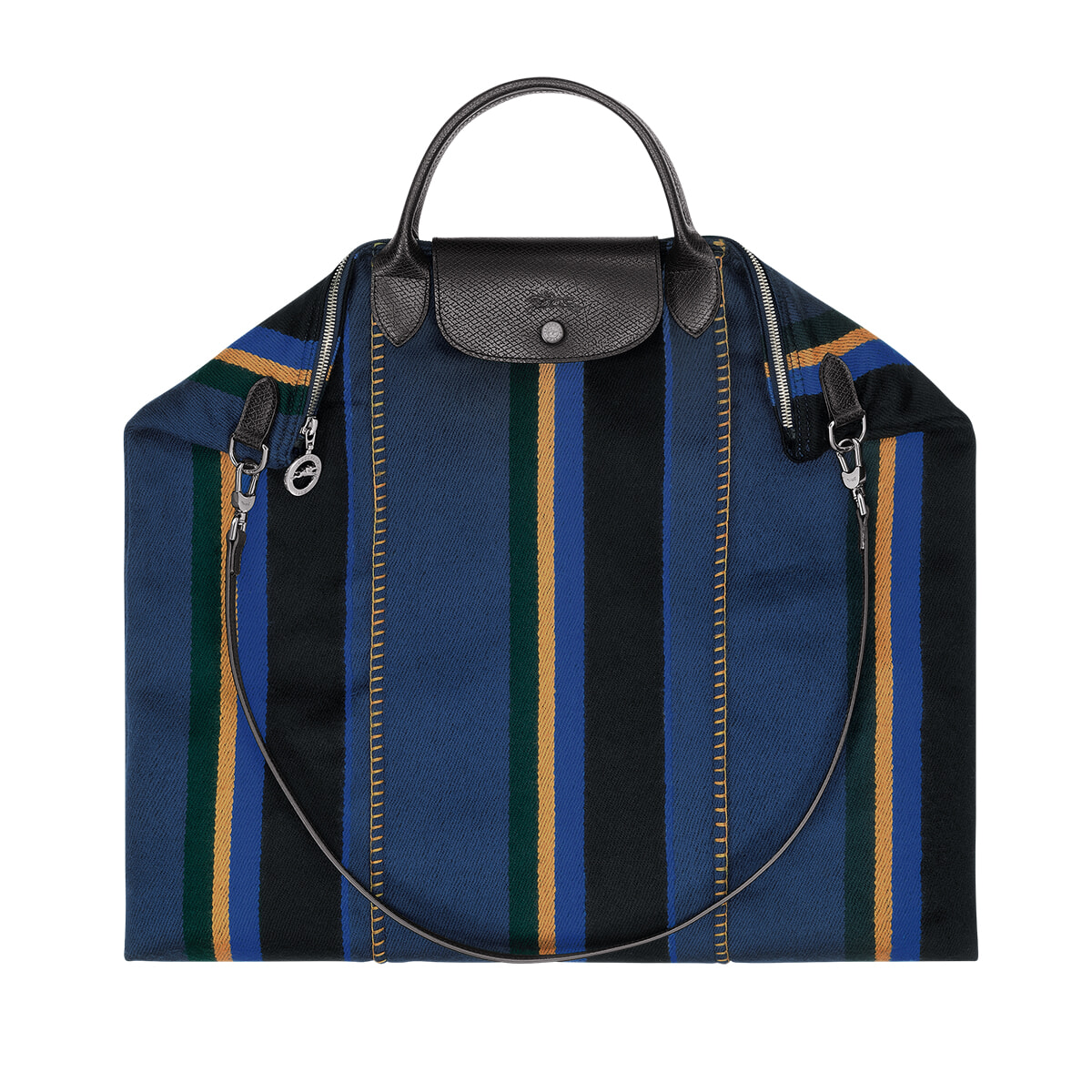競走馬にかける毛布が着想源となった「ル プリアージュ® パドック」は今季のニューフェイス。ブルーとイエローのアシメトリーなストライプ模様がキャッチーで、オンでもオフでも大活躍の予感! 取り外し可能なストラップ付き。