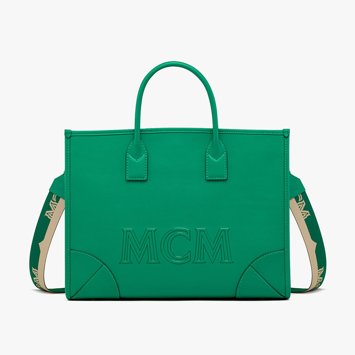 柔らかなスペイン製カーフレザーを使用したラージサイズのトートバッグ。「MCM」エンボスロゴとカジュアルなストラップデザインがスポーティな印象。爽やかなグリーンがスタイリングの差し色に。ショルダーストラップ付き。