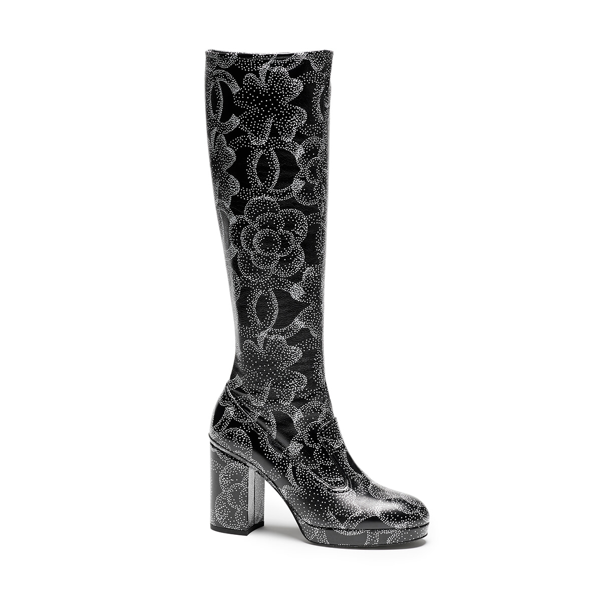 この秋冬のシーズンテーマでもあるカメリアの花とシャネルのダブルCのモチーフを全面に配したロングブーツ。まるでアート作品のような1足は、クラシックな雰囲気の中に華やかさが宿る。