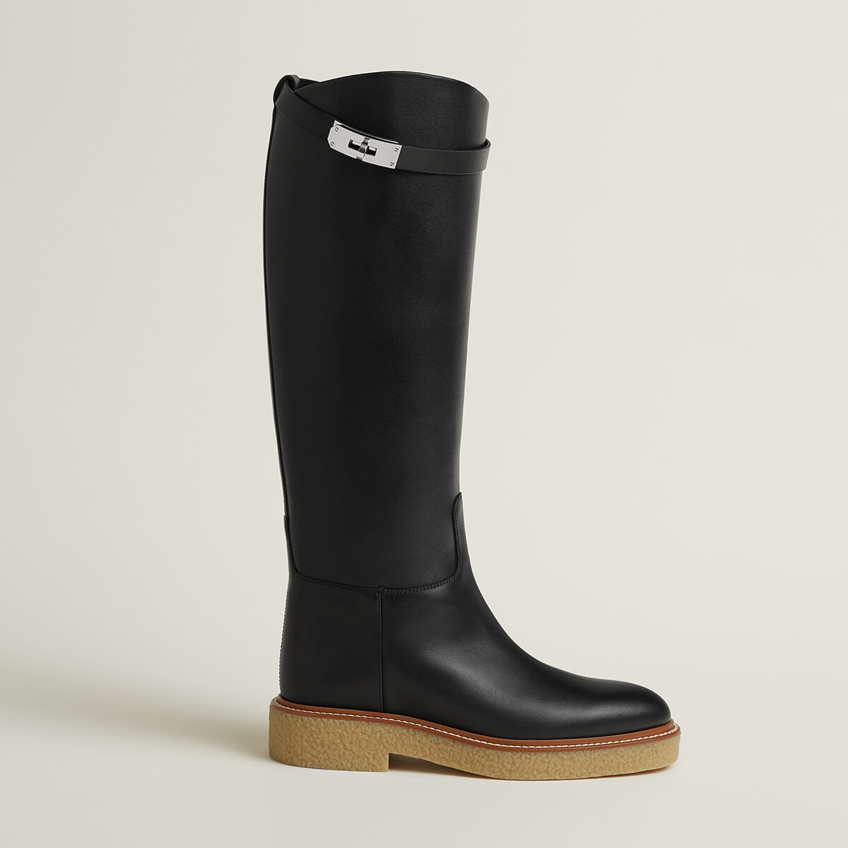 2004年に登場し、長らく愛されたエルメスのアイコニックなブーツ「ジャンピング」の直系モデルがこちらの「ハニー」。バック「ケリー」のクラスプはそのままに、軽量で分厚いアウトソールを纏って新登場!