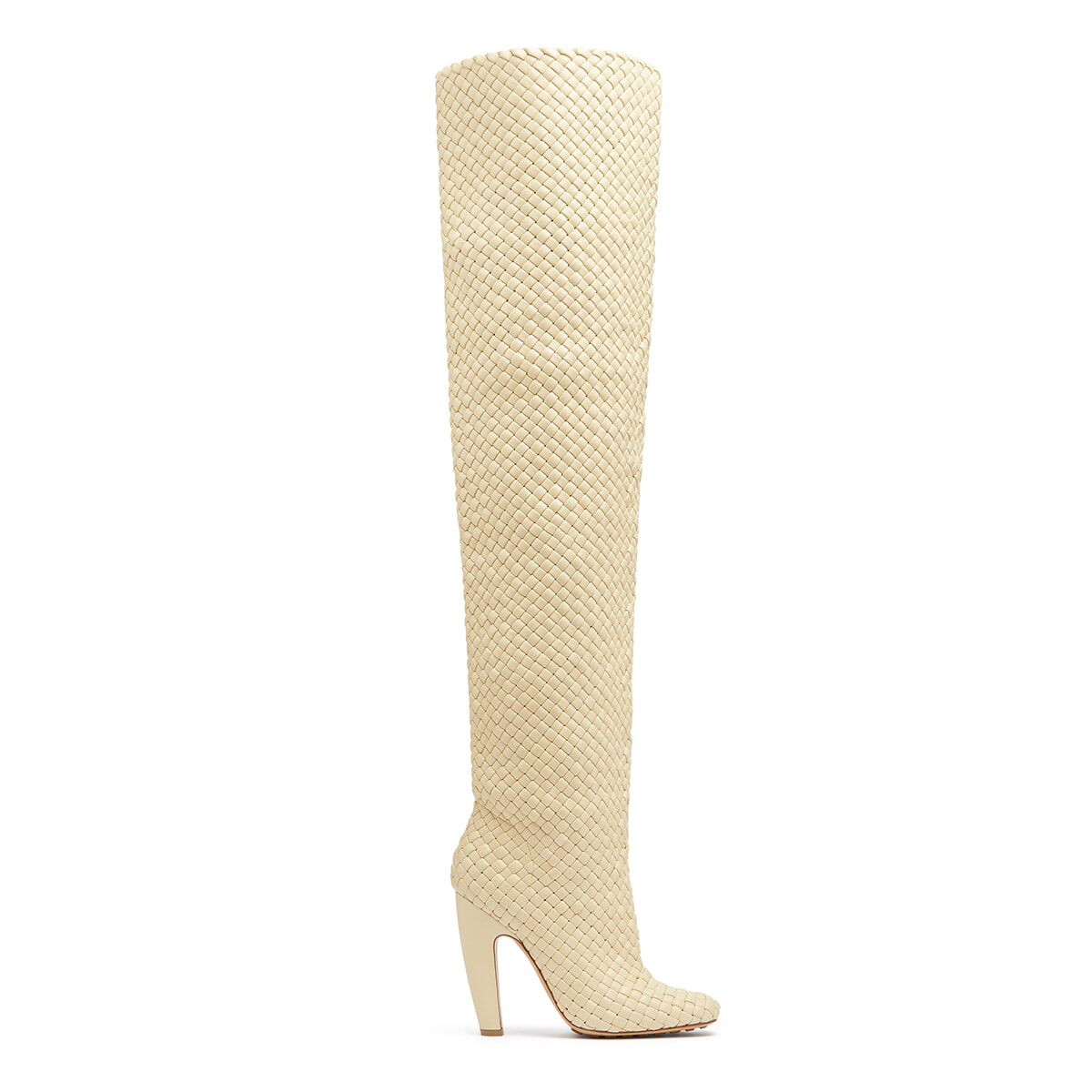ブランドのアイコンディテールであるイントレチャートのオーバーニーブーツ。肌触りがなめらかなラムスキンと、オフホワイトのなめらかなカラーが、品格あるアティチュードをもたらす。アウトソールにはラバーインジェクションレザーを採用。