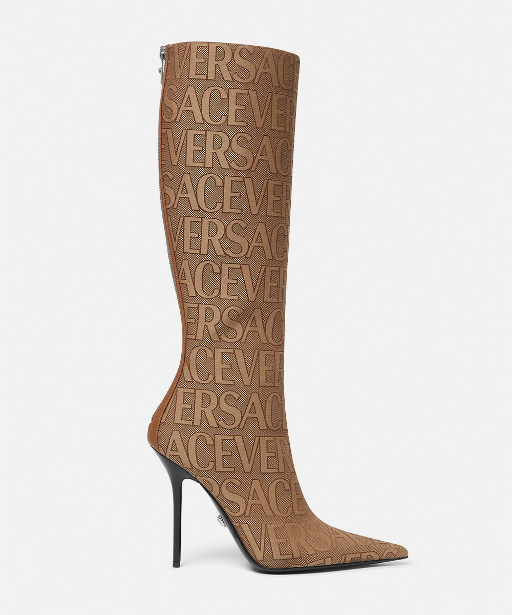 ヴェルサーチェ オールオーバー柄をジャカード織りで全面に配したニーハイブーツ。シャープなポインテッドトウ、華奢なヒールをポイントに、美しいシルエットを誇る。ジップタイプで着脱しやすく、トリムは滑らかなカーフレザーを用いることで上品な印象をプラス。