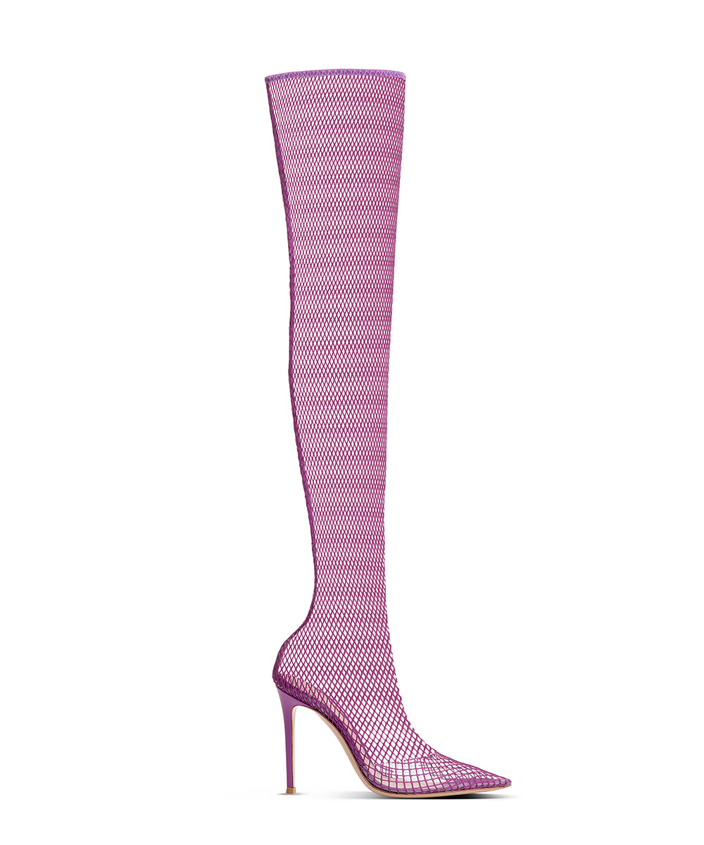 ストレッチの効いたピンクのフィッシュネットとスティレットヒールが特徴的な「アイレス」。ブーツ上部は同色の伸縮性のあるトリムで仕上げ、まるでバーレスクのダンサースタイルのようなセンシュアルさ。