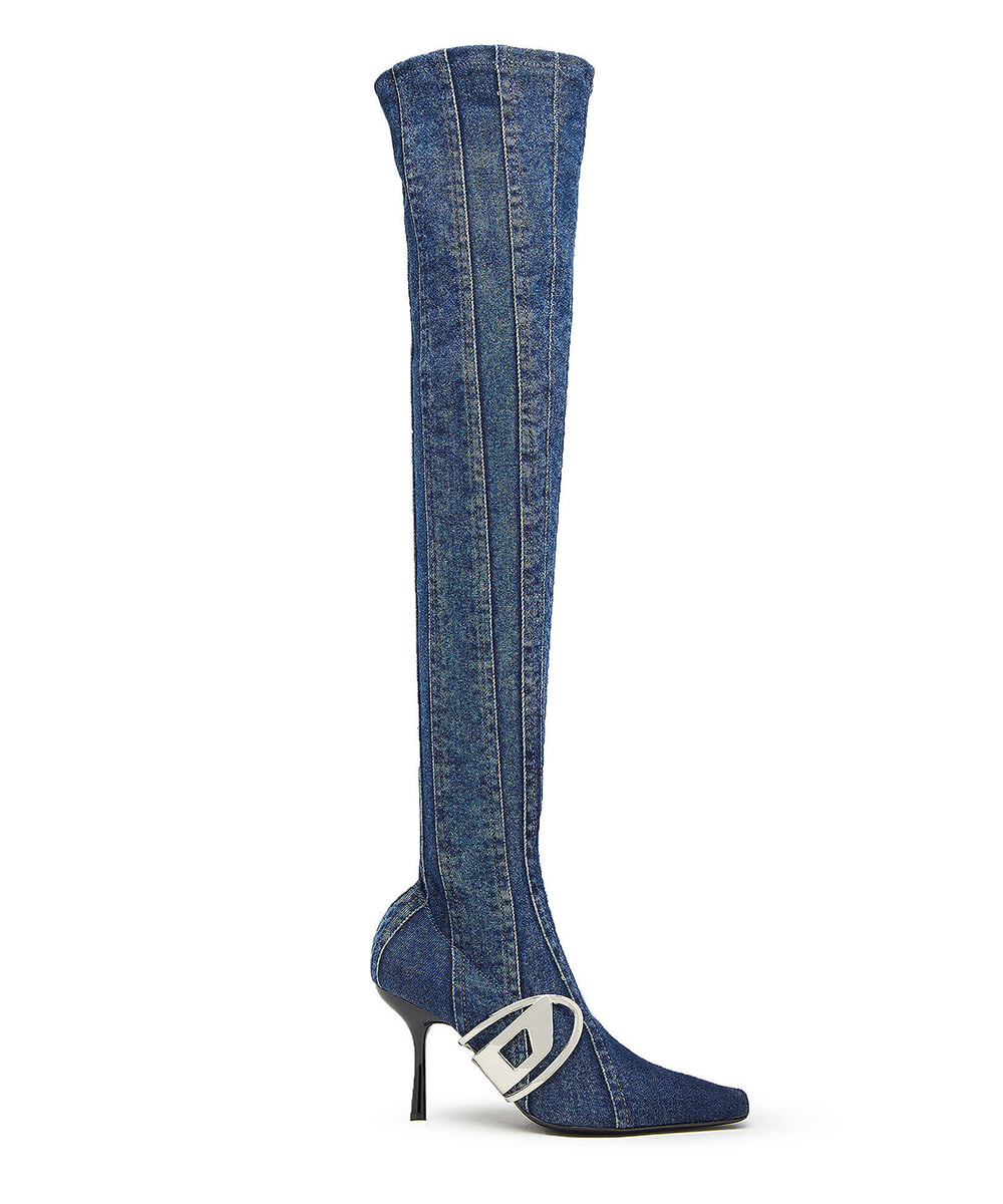 今季流行のタイトコンシャスなシルエットが美しい「エクリプス」シリーズのニーハイブーツ。スポーティな印象のウォッシュドデニムに、縦ラインを強調するステッチと、シャイニーメタルのオーバルDをアクセントに施した。ポインテッドトゥに向けしなやかなシルエットが女性らしい。