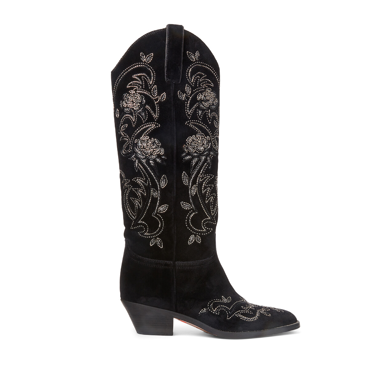 ベルベットにフラワーモチーフの繊細な刺繍を施し、ウエスタンブーツをドレッシーにアップデート。デニムをインしてマニッシュに履きこなしたい。