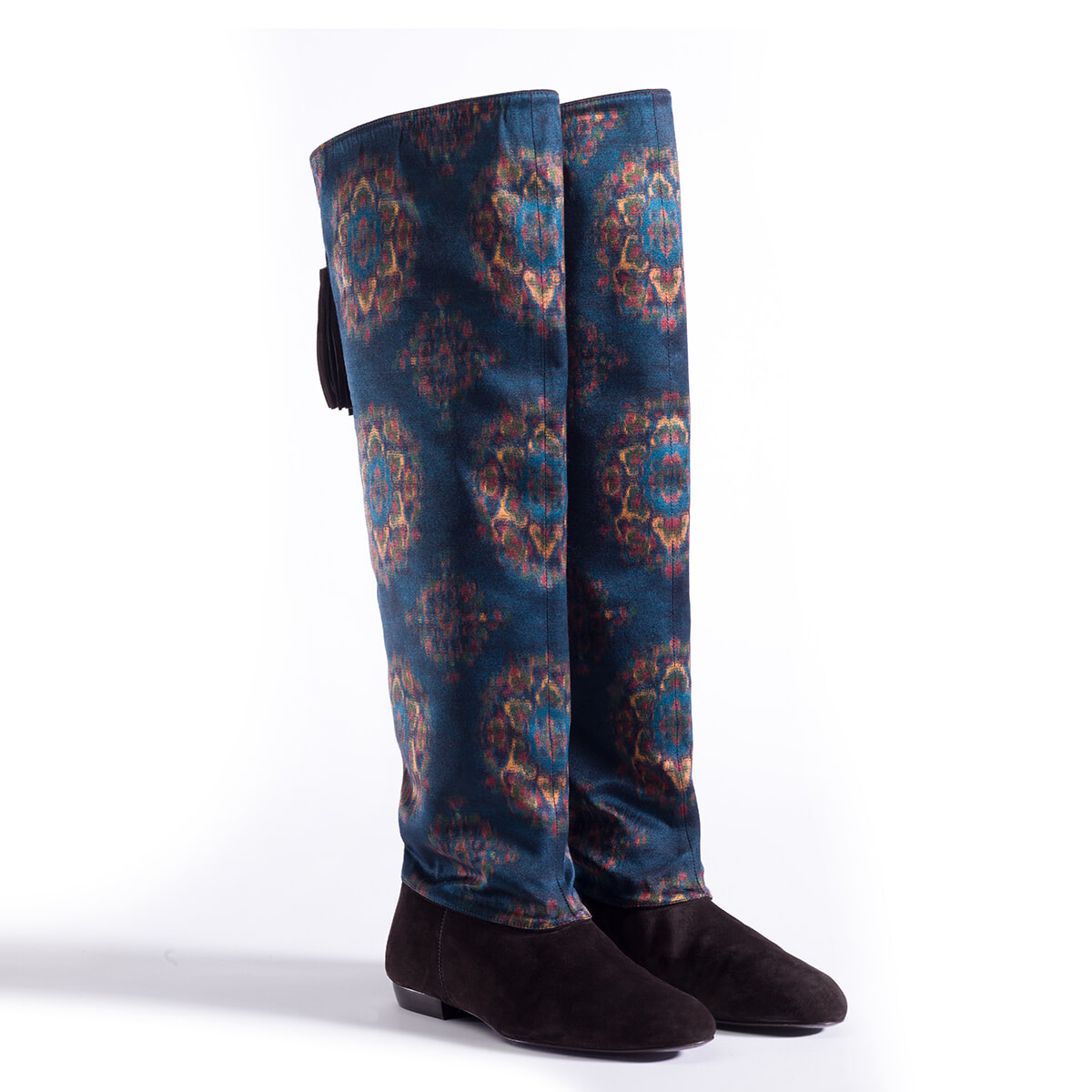 アッパーのカーフスキン・スエードとシルクカシミヤを用いた、異素材使いの「フロア・ブーツ」。シルクカシミヤに東洋風の鮮やかな花柄のジャカード織りが施され、エレガントな表情に。背面にあしらわれたカーフスキン・スエードのタッセルがアクセント。